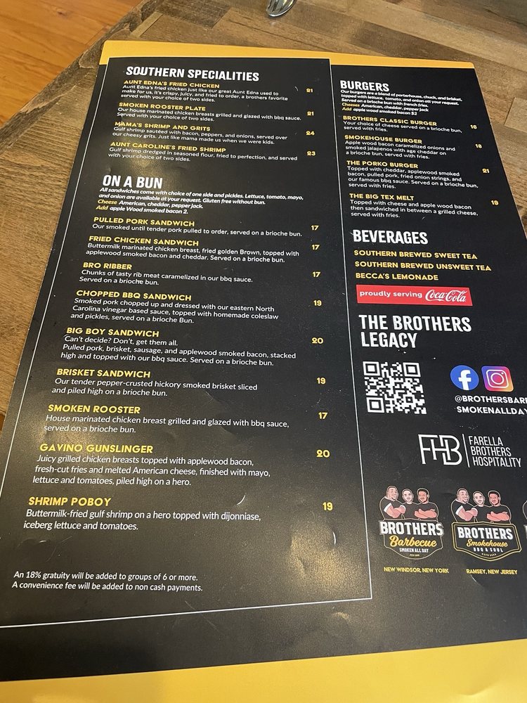 Welcome to Brothers BBQ NY, where the essence of soul food meets a casual yet classy dining experience. Nestled in New Windsor, NY, this BBQ haven takes reservations and offers convenient delivery and takeout options. The menu highlights star dishes like the Bro Ribber, featuring smoked pork dressed in a tangy Eastern North Carolina vinegar sauce with homemade coleslaw on a brioche bun. For chicken lovers, the Rooster Sandwich flaunts marinated, grilled chicken glazed with BBQ sauce.